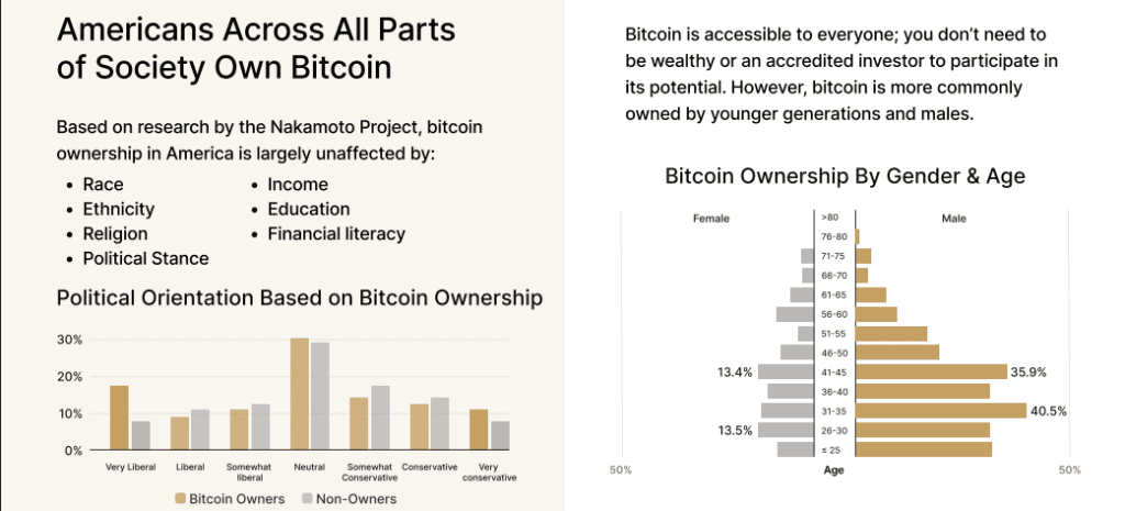 These principles promote early adoption of new financial instruments, including digital assets. There are demographic patterns evident. Men and young adults are the leaders in ownership. They are more technologically advanced and more willing to take risks. That said, interest in BTC cuts across the board and is independent of race, religious belief, and politics.