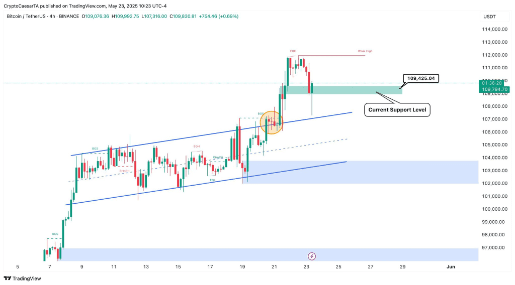 As Bitcoin attempts to recover from the sharp decline, analysts are closely monitoring critical support and resistance zones. Trader Crypto Caesar highlighted a support range just under $110,000, emphasizing that holding above this level is essential for any short-term bullish continuation.