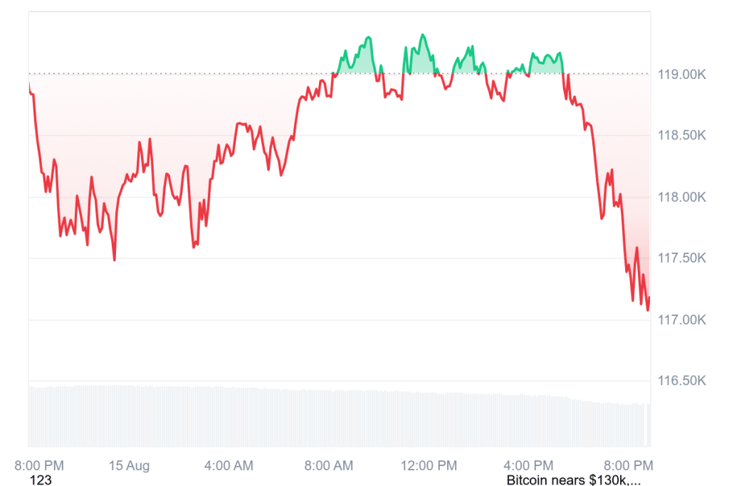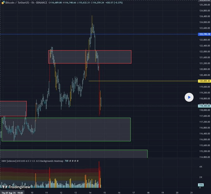 That announcement, together with softer inflation data, contributed to a steep price reversal. Bitcoin reached a local low in the vicinity of the $117,500–$116,000 area, which has been a region of high volume accumulation in the past. Traders are currently monitoring buyers’ reactions within this area.