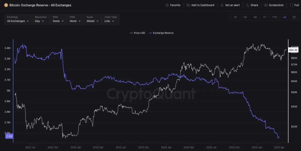 According to on-chain analytics firm CryptoQuant, the supply of Bitcoin held on centralized exchanges (CEX) has plummeted to a seven-year low, falling to just 2.492 million BTC. It marks a notable decline from the 2.488 million BTC recorded the previous Friday. Such a reduction often indicates strong investor accumulation, reducing immediate selling pressure and setting the stage for upward price momentum.
