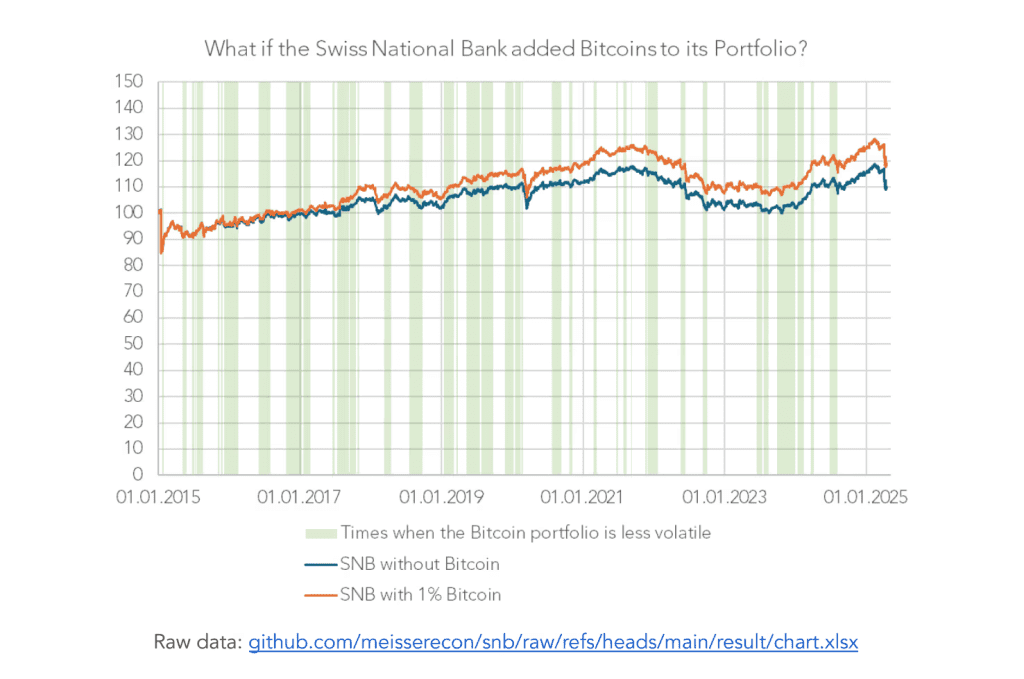 The BTC Initiative pushed back against the SNB position with a comprehensive study. If they had invested only 1% of the portfolio of the SNB from 2015, they would have almost doubled returns by 2024, based on their research. Volatility would have been only incrementally higher, their study indicated.