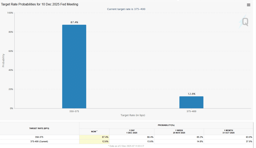 The interest rate announcement on December 10 by the US Federal Reserve may turn out to be the trigger for the advantage of Bitcoin prices in 2026. Markets are putting a price on an 87.4% probability of a 25-basis-point decrease of the rate, according to the CME Group’s FedWatch tool. The rate cut may stabilize the general economy and aid in the recovery of Bitcoin in the next year.