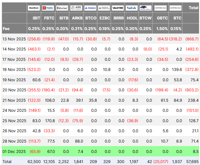 US spot Bitcoin ETFs experienced major outflows in November, amounting to $3.48 billion. This was one of the worst months in the history of these funds. Nonetheless, Bitcoin ETFs have recorded flashes of turnaround, four days of straight flows, including a small amount of $8.5 million on Monday. This may be an indication of gradual re-entry of investor enthusiasm following the recent sell-off.