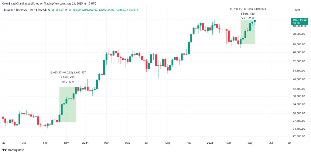 - Bitcoin surged to an all-time high of $109,458 on May 21, 2025, marking seven consecutive weekly gains, the longest bullish streak since 2023.