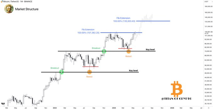 Crypto trader Titan of Crypto shared an optimistic outlook, suggesting that a Bitcoin price target in the range of $135,000 remains “very much in play” for 2025. Titan’s forecast uses the Fibonacci extension tool, a popular technical analysis method. It predicts potential price levels by measuring previous market swings. The critical 1.618 Fibonacci extension level, drawn from the recent swing low to swing high, aligns with a target zone between $135,000 and $140,000.