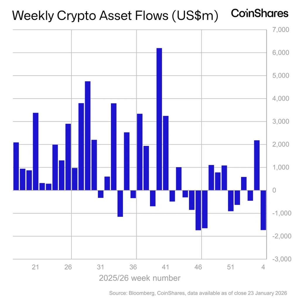 CoinShares head of research James Butterfill said the decline reflected weaker expectations for interest-rate cuts. He added that price action remained soft. He also noted frustration that crypto has not benefited from U.S. dollar weakness.