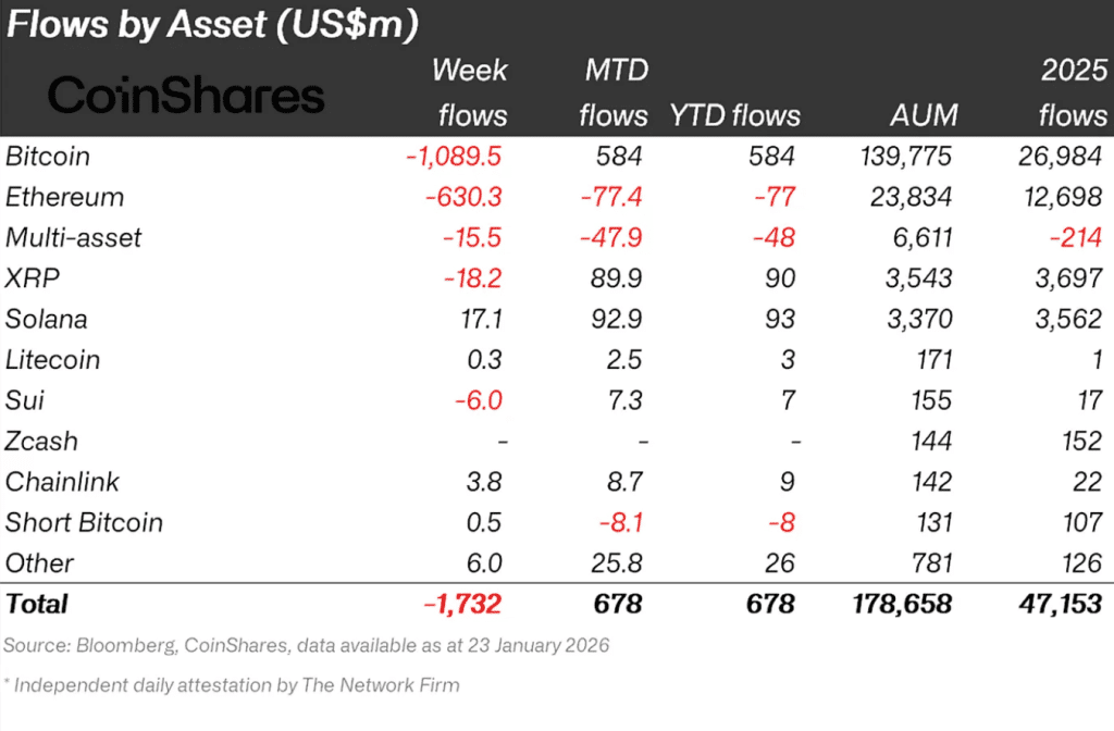 Crypto investment products recorded one of their worst weeks on record. The CoinShares report shows $1.73 billion in net outflows, the largest since mid-November 2025. The reversal followed a $2.2 billion inflow the week before. Total AUM across crypto funds fell to $178 billion from $193 billion.