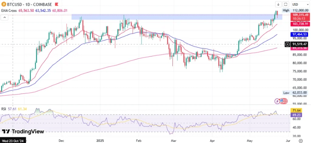 BTC is currently hovering around $108,716, near a heavy supply zone. If this resistance level holds, Bitcoin may retest the $100,000 support level. Technical indicators like the Relative Strength Index (RSI) are also flashing caution, with RSI retreating from overbought territory at 68.19, suggesting a cooling-off period may be imminent.