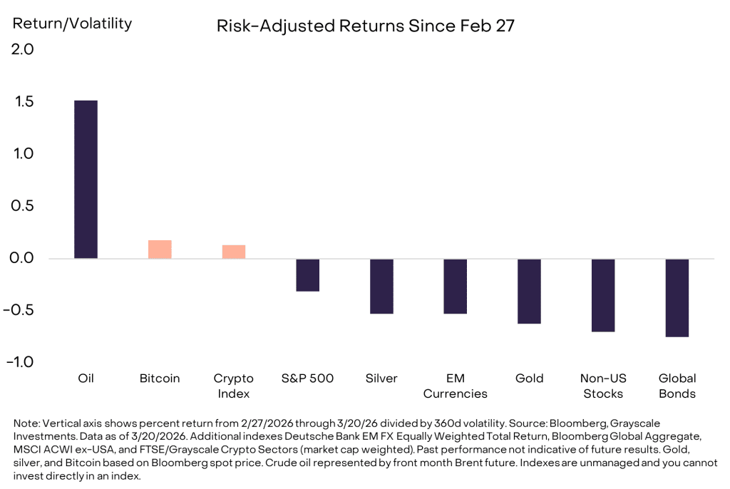 - Crypto assets show small gains during global market stress.