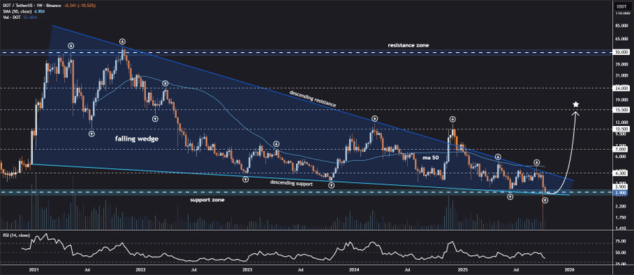 Jonathan Carter, a well-known analyst, highlighted that Polkadot (DOT) is currently positioned at the bottom of its lower wedge boundary on the weekly chart. He indicated that the price is respecting this major support zone, which might be an indication of signs of early reversal. The current compression in the market is not permanent, and there is speculation that a breakout can soon take place.