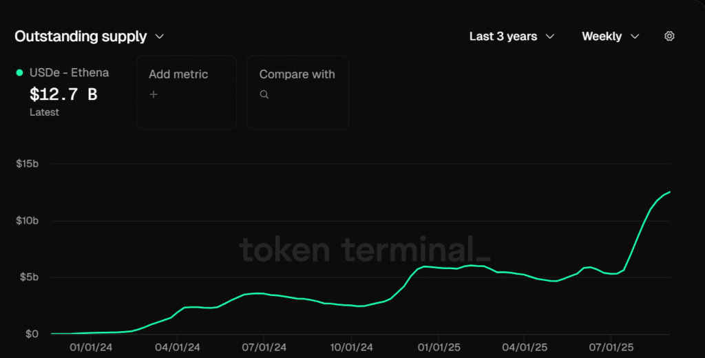 - USDe supply climbed to $12.6B within ten months, ranking third among global stablecoin issuers by size.