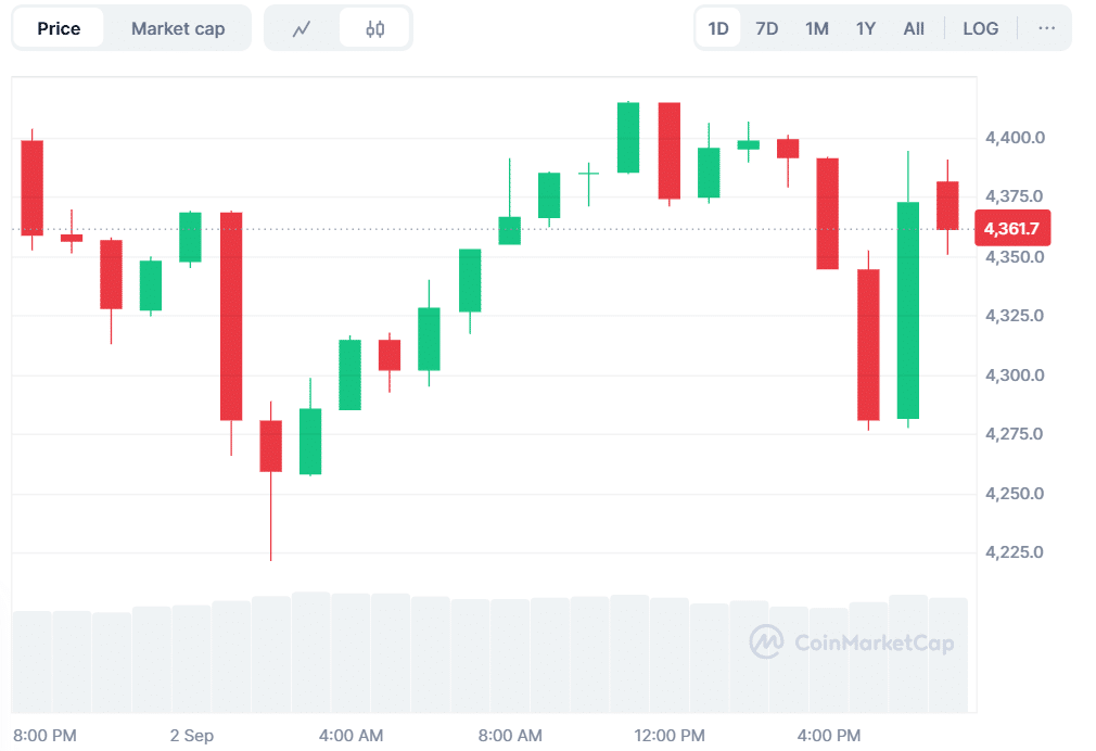 Ethereum (ETH) is currently trading at $4,362 with an increase of 0.76% in the last 24 hours. The trading volume has increased by 11.5 percent to $36.26 billion. Analysts observe that momentum is bullish in the short term, indicating increased investor activity.