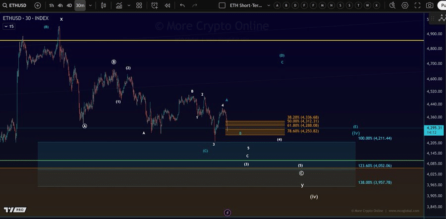 Crypto analyst More Crypto Online highlighted that ETH responded to the 100-percent extension target at approximately $4,211 yesterday and then showed a small pullback. He stated that the larger picture remains the same.