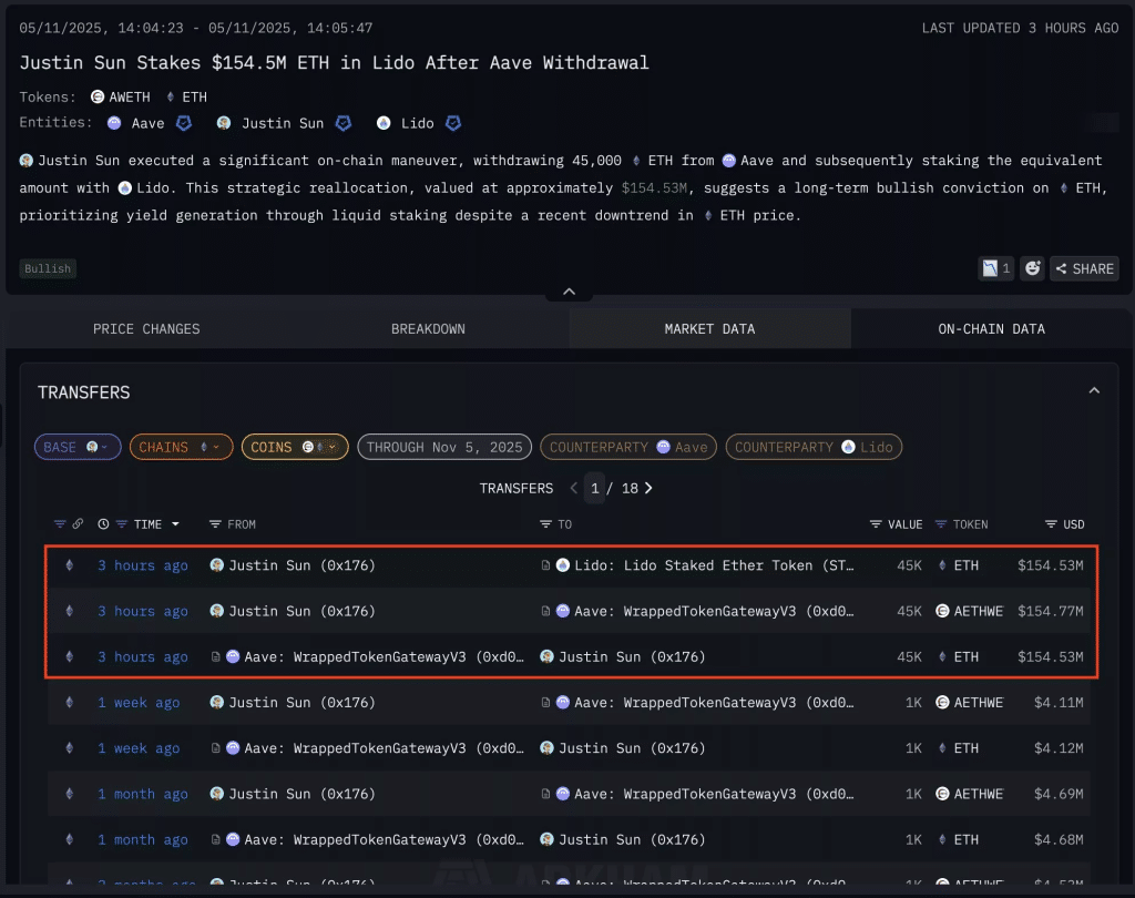 Arkham Intelligence traced money movement within the blockchain. Its monitoring system verified that the assets were placed into Lido as stETH, a token that is a representation of staked Ethereum. The AI Agent used at Arkham realized that Sun looped ETH to AWETH and sent it back to AAVE during the last shift. The system explained the deal by a systematic internal rebalancing.