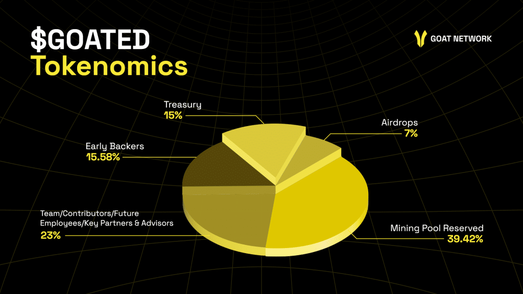 - 40% of $GOATED tokens are allocated to mining rewards, while 23% support the team, partners, and advisors.