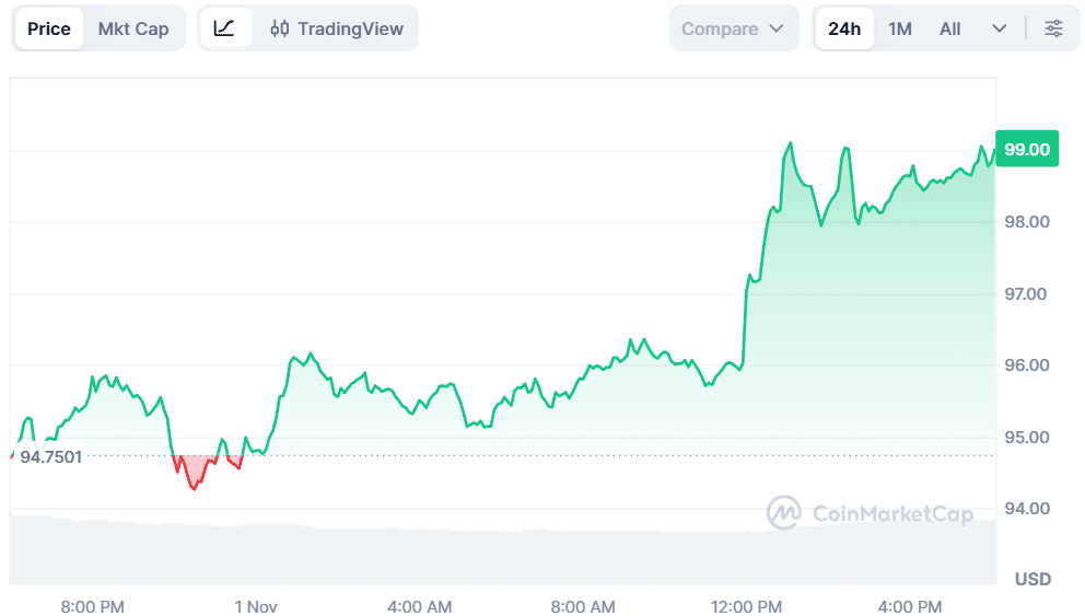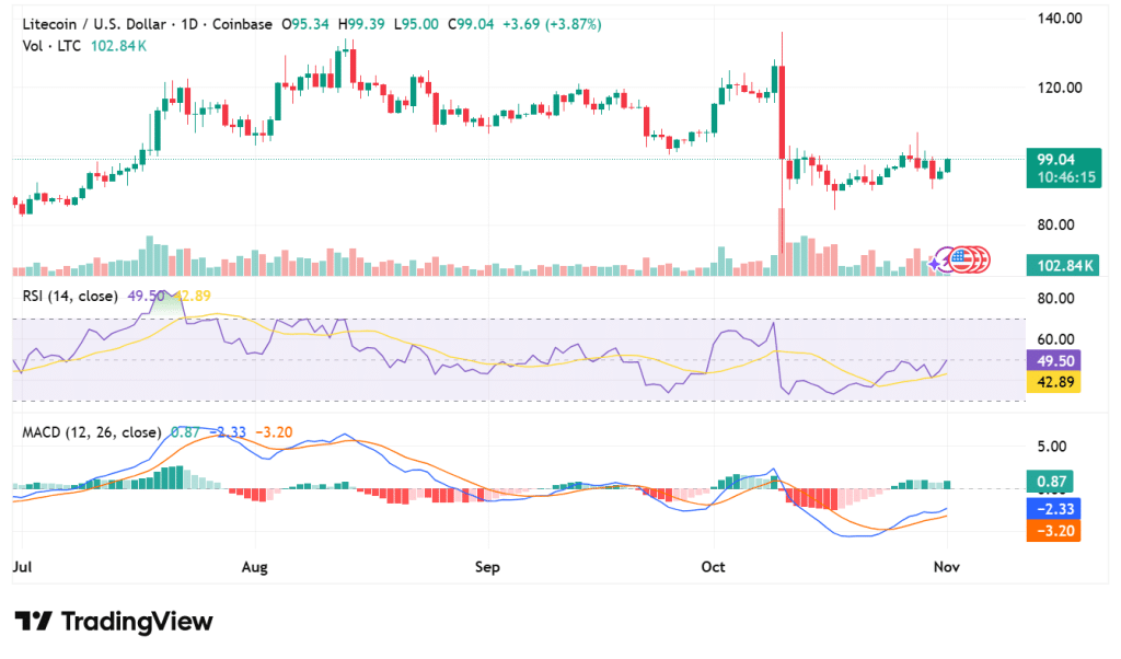 Litecoin (LTC) is currently trading at $98.83, up 4.48% in the past 24 hours. The price has increased, but its trading volume has decreased by 6.58% and is now at $708.2 million. This increase in prices together with decreasing volume indicates cautious optimism from the traders, as lower participation is driving the gains recently.