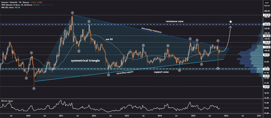 A prominent analyst, Jonathan Carter, highlighted that Litecoin is playing in the upper part of its symmetrical triangle on the weekly chart, which is a key point of resistance for determining the next major move. He said a confirmed breakthrough above this range would generate a bullish wave towards $140, $180, and possibly $285, indicating that it could be a continuation of the upward momentum.