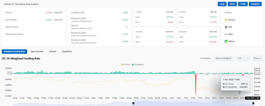 According to CoinGlass data, Litecoin’s trading volume was down by 21.90% and now stands at $740.65 million, with Open Interest (OI) increasing 4.05% to $456.56 million. The OI-Weighted Funding Rate of 0.0018% is neutral. These numbers suggest that the market is set up for a technical breakout but that it has not yet confirmed the move.