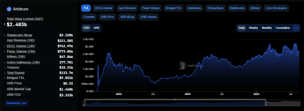 - Arbitrum, with a $2.4B TVL and lower fees, remains a top Ethereum Layer 2 despite market challenges.