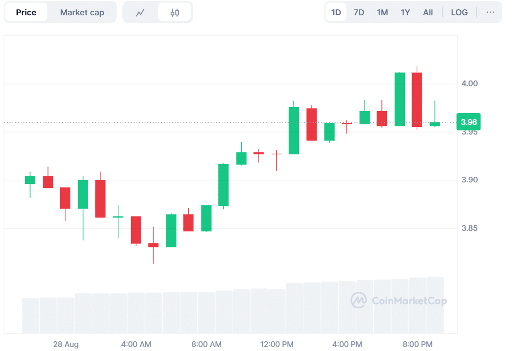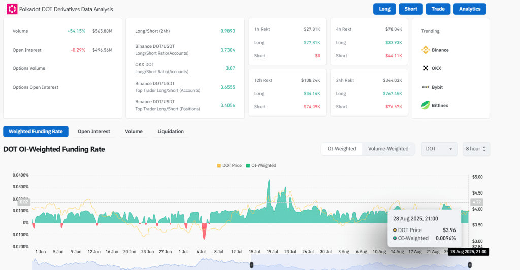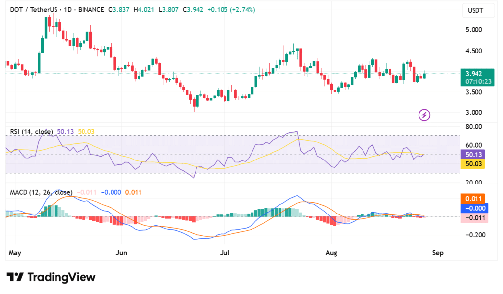- Polkadot trades at $3.96 with rising volume and steady weekly gains boosting investor confidence.