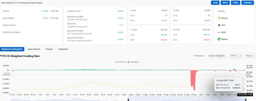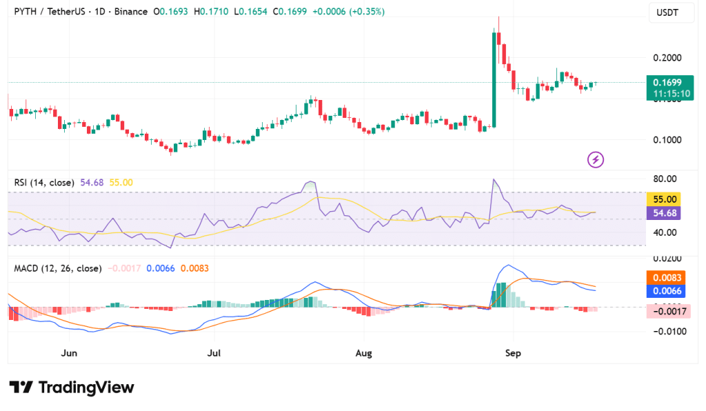 - PYTH is priced at $0.1692, up 5.13% in 24h, with volume rising 24.89% to $85.85M, signaling higher activity.