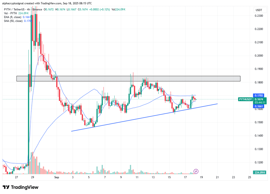 Alpha Crypto Signal highlighted that on the 4-hour chart, PYTH is forming an upward triangle. The structure indicates consistent high lows acting at resistance at $0.185-$0.190. This trend is typically considered to be bullish since it indicates accumulation. The buyers will come into the market at higher levels every time, narrowing the price band and indicating an accumulation of pressure towards a breakout.