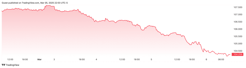 Pal identified dollar weakness, interest rates, and oil prices among the three factors. The US dollar’s performance stands out as the most significant driver for crypto markets. Investors often seek assets like Bitcoin to hedge against inflation and currency depreciation as the dollar weakens. This trend is reflected in the recent movement of the US Dollar Index (DXY), which tracks the dollar’s strength against a basket of major currencies. Since shows 5, the DXY has fallen by 2.79%, currently at 104.258, according to TradingView.