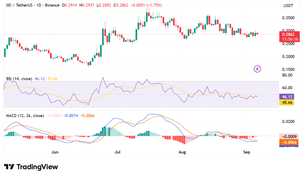 - RSI at 46.12 and MACD bearish crossover signal weak momentum, keeping SEI under short-term bearish pressure.