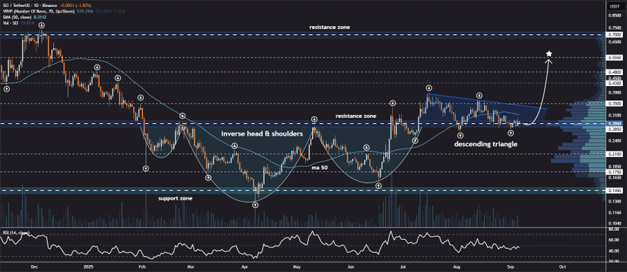 Analyst Jonathan Carter highlighted the neckline retest at SEI. He noted that the coin is holding the opposite head-and-shoulders breakout at the level of $0.285. This is a very important zone that traders take seriously.