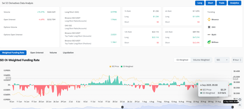 - SEI trades at $0.2860, down 1.72% in 24h, while volume jumps 20.08% to $149.49M, showing strong trader participation.