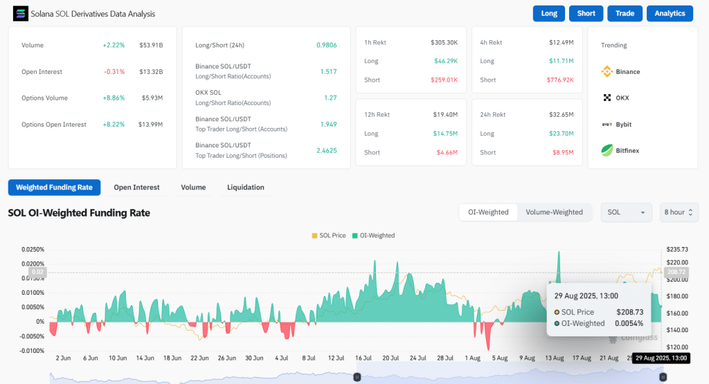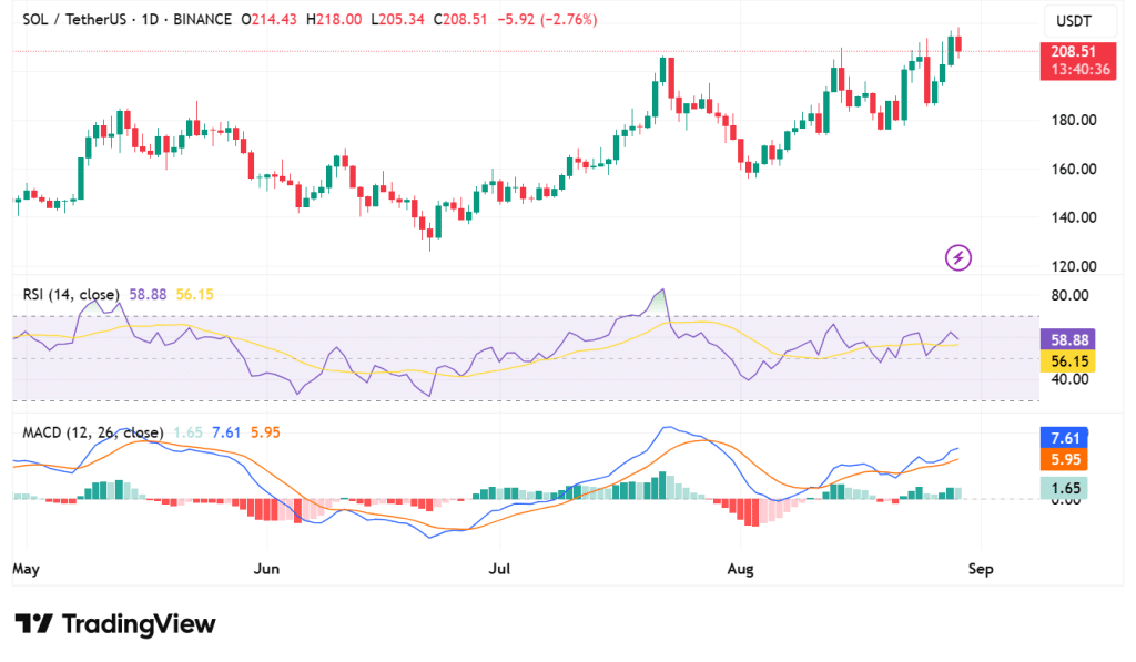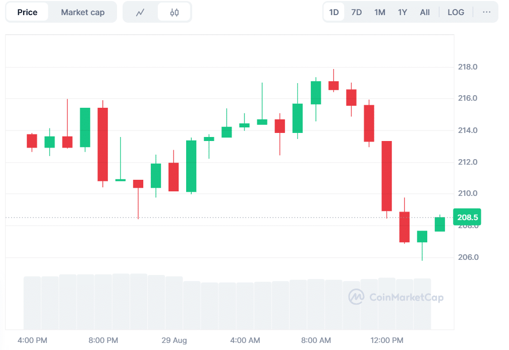 Solana (SOL) is currently trading at $208, and it has fallen by 1.98% during the last 24 hours. The trading volume has declined, falling 4.27% and currently standing at $13 billion, indicating a slowdown in short-term momentum.