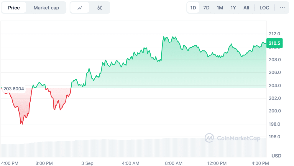 Solana (SOL) made a comeback in the cryptocurrency market. The token was trading at $210, up 3.75% in the last 24 hours. Trading volume rose 47.39% and is currently at $9.14 billion. Solana has gained 2.94% over the past week. Analysts believe that bullish momentum is likely to persist on the back of sustained investor demand.