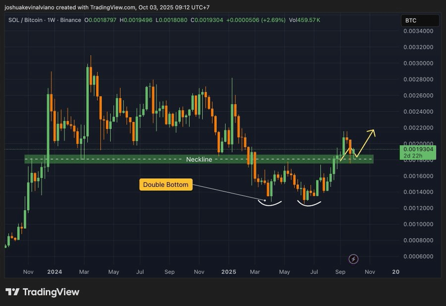 Analyst CryptoPulse highlighted that Solana is retesting the Double Bottom neckline, one of the most important technical levels. In most cases, the neckline becomes a level of support following a breakout. Solana has an opportunity to outperform Bitcoin in the coming weeks if it holds this level and recovers. Solana may also have the chance of retesting its past all-time highs at around $295.