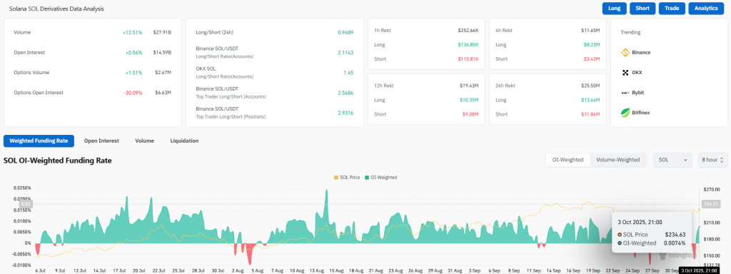 According to CoinGlass data, there is a higher level of activity in the market. The trading volume is increased by 12.51%, reaching up to $27.91 billion, which demonstrates greater interest in Solana. Open Interest also surged by 0.54% to $14.59 billion. The SOL OI-Weighted Funding Rate is at 0.0074%, which represents a stable market environment.