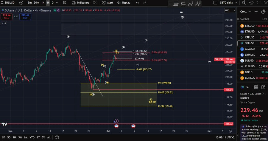 Another analyst, Man of Bitcoin, revealed that Solana is probing the resistance area for a possible high on wave-B. The rationale for the next level target of the 1.38 Fibonacci extension at $240. Any breach of this level would reinforce the bullish trend. The micro support level of $215.00 is still crucial, as it maintains the upward momentum.