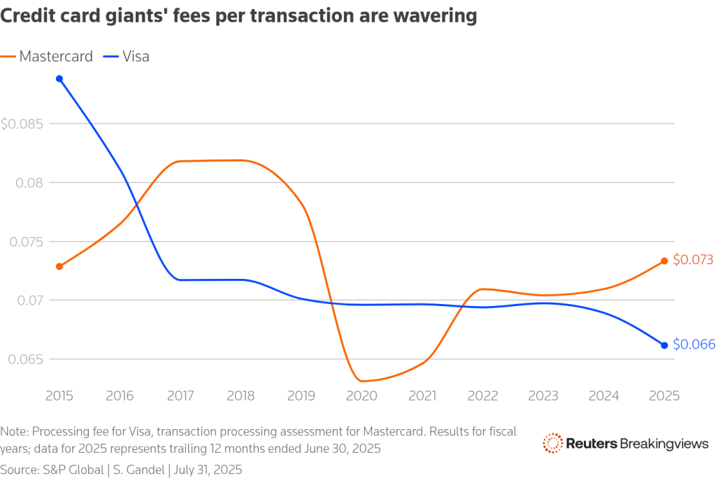 This comes from charging merchants a small cut per transaction. But that income is showing signs of pressure. Visa now earns 6.6 cents per transaction. That’s down from nearly 9 cents a decade ago. Mastercard has seen a similar drop. While part of this is due to business and money models evolving, there’s increasing pricing pressure.