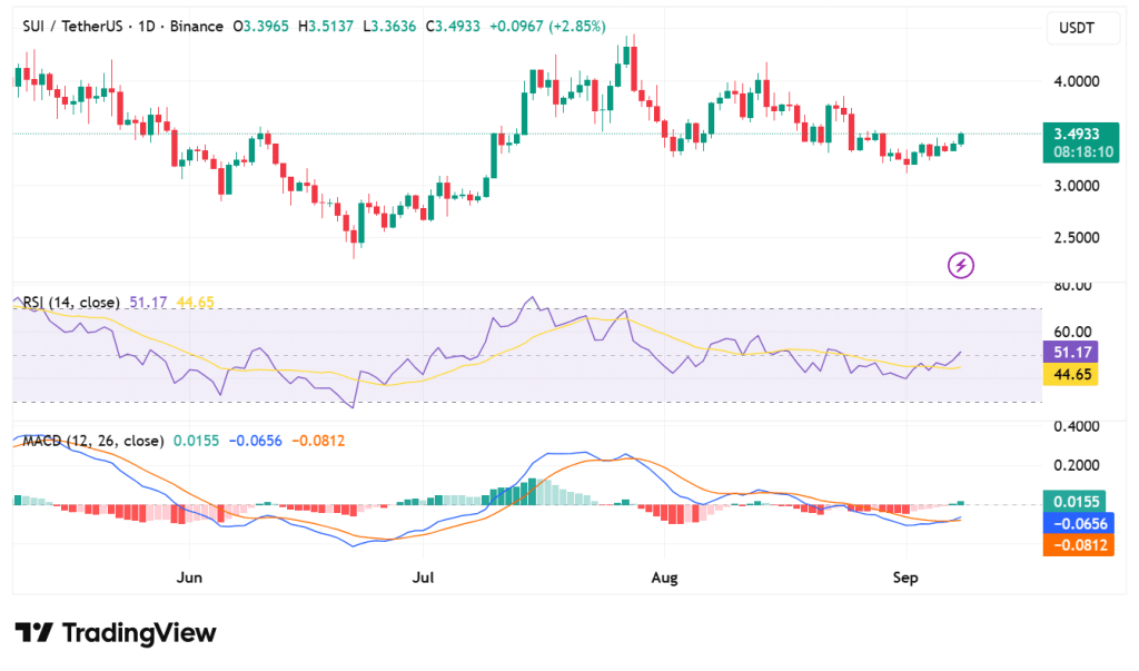 The Relative Strength Index (RSI) stands at 51.17 now, which is slightly higher than the neutral zone. This indicates equal market conditions but a bias toward buyers. Any upward shift would indicate a growing demand and indicates that SUI is becoming appealing to higher buyers. The trend in the RSI confirms the possibility of upside momentum.