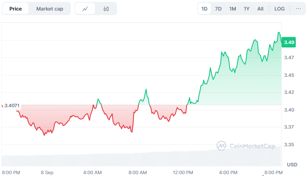 SUI is expected to show bullish movements because it is currently trading at $3.49, marking an increment of 2.66 percent in the past 24 hours. The trading volume has increased by 84.71 percent to stand at $942.85 million. There is evidence of an increased involvement in the market, and it may proceed in an upward trend already in place.