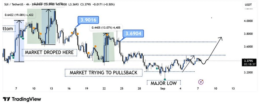 Crypto analyst BitGuru highlighted that SUI recorded a huge low of about $3.20, which formed a foundation of the current recovery. The analyst reported that SUI had previous pullbacks at $3.90 and $3.69 that, despite halting the upward trend, did not defuse the overall trend.