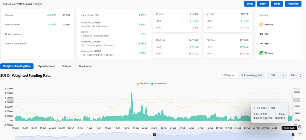 - SUI shows a 2.66% daily gain at $3.49 as volume jumps 84.71% to $942.85 million, signaling momentum.