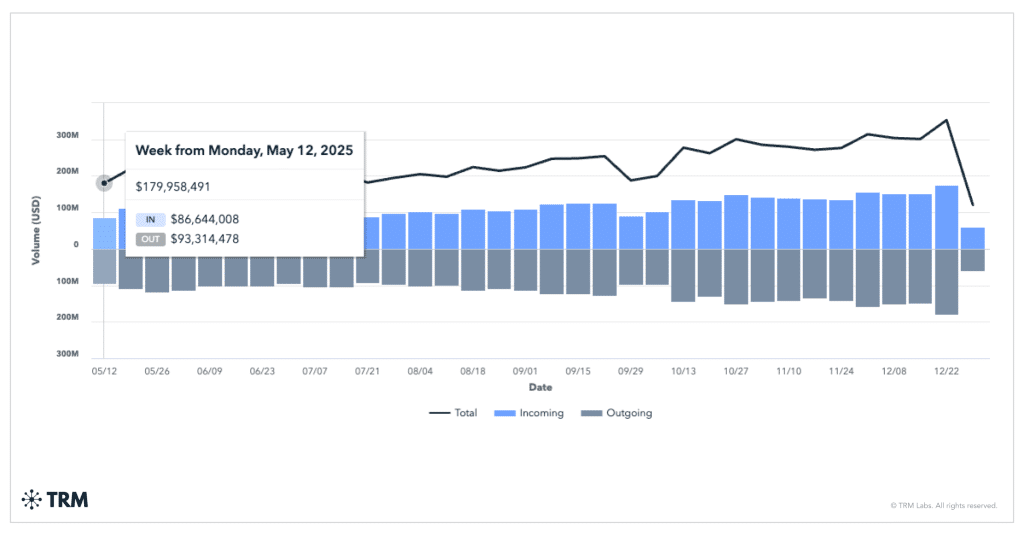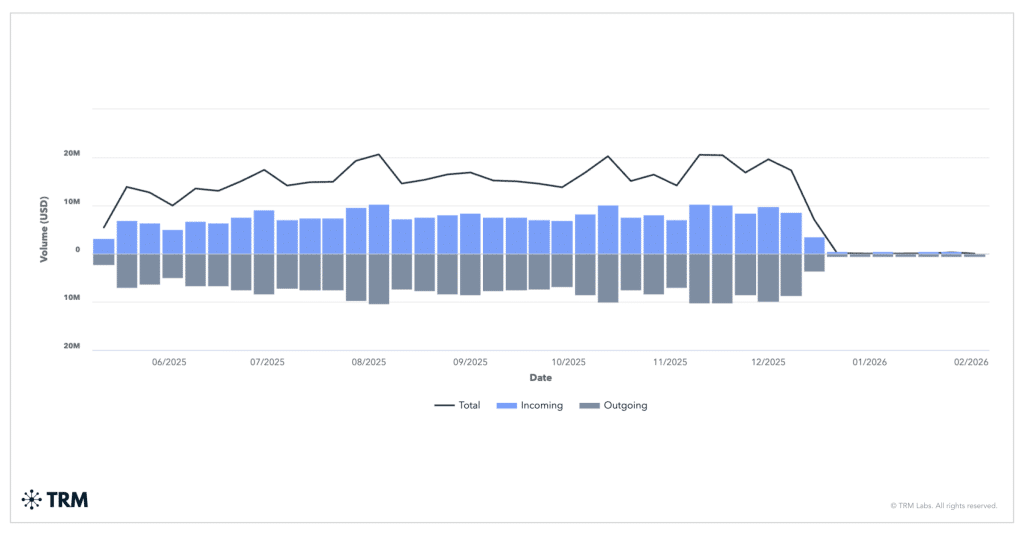 Xinbi was not greatly affected by the move. They were able to reactivate their channels quickly and maintain their users’ activities. Their inflows increased towards the end of 2025. There was a new surge in January 2026, but this was due to arrests and closures. Tudou was closed by the authorities.