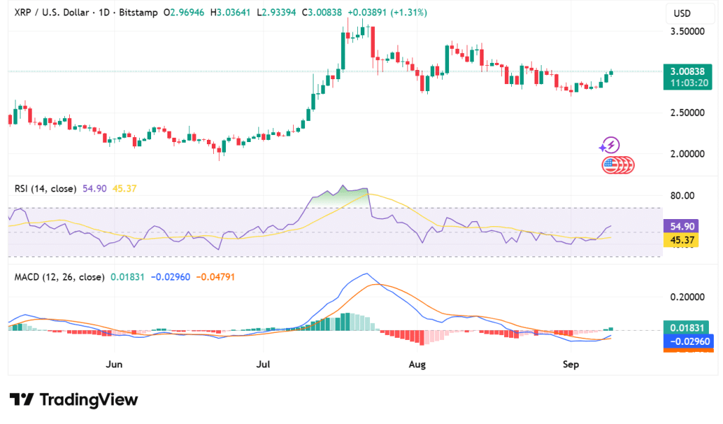 Ripple (XRP) is currently trading at $3.00 following a 1.41% daily increase. The trading volume had gone up by 5%, and now it is at $6.46 billion. XRP has experienced an 8.59% increase over the last week, which is consistent with its trend of gradual upward movement. Price behavior is strengthening, but investors are watching closely as the momentum builds above major resistance.