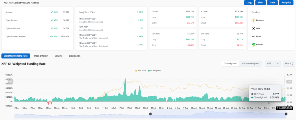 According to the CoinGlass data, the trading volume has increased by 3.56% to $7.21 billion. Open Interest increased by 2.97% to $8.22 billion. The OI-Weighted Funding Rate presently stands at 0.0096%. This indicates that the buyers are maintaining long positions even though prices are rising.