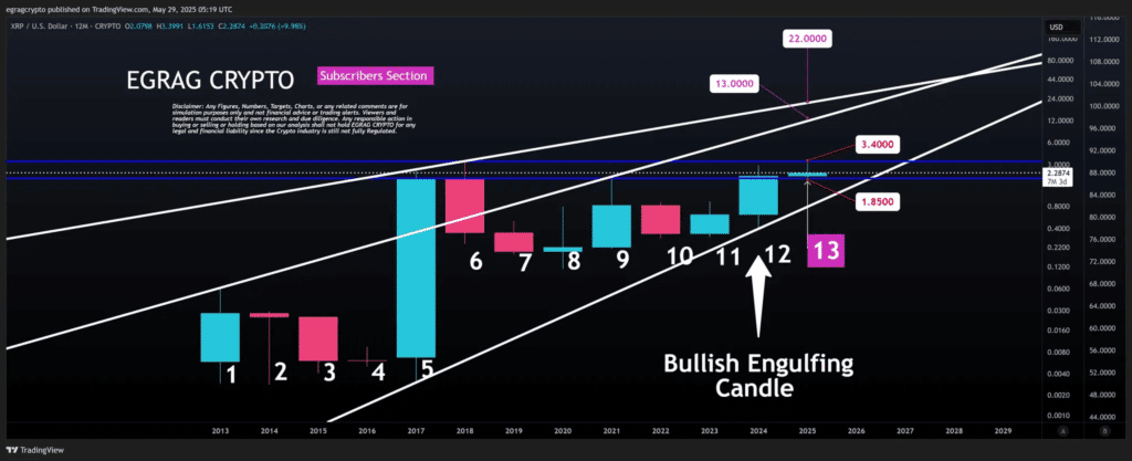 Amid this market lull, widely followed crypto analyst EGRAG CRYPTO has stepped in to offer a long-term perspective that could reshape sentiment. In a recent post on X (formerly Twitter), the analyst revealed what he calls a “rare and powerful bullish signal” visible on XRP’s yearly chart.