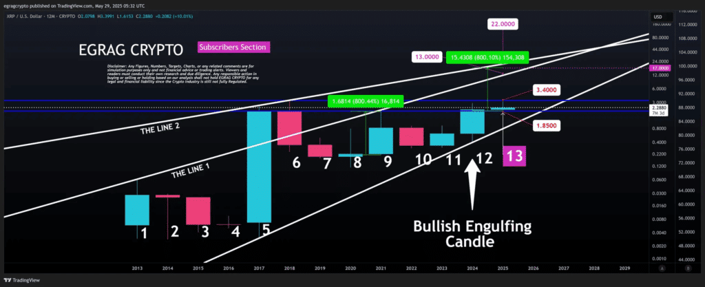 Most notably, he spotlighted the potential implications of “Candle 13,” likening its setup to the 800% surge XRP experienced during the 2021 bull run. Applying that same percentage gain to current levels could see XRP rally to as high as $17 this cycle.